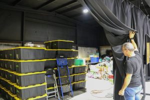 Photo by Lydia Berglar – Nelson Ferrer shows the storage area of the warehouse where donated items have been sorted and stored, ready to be given to anyone who asks.