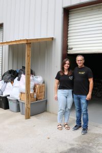 Photo by Lydia Berglar – Nelson and Amelia Ferrer started Servant’s Heart Ministries to collect and distribute donated items that may meet someone’s tangible need. Here, the couple poses outside of the McKaig Road warehouse with donations stacked on top of the bins.